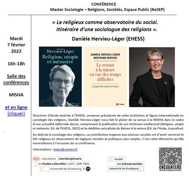 Le conférence de Mme Danièle HERVIEU-LÉGER, prévue le 7 février, est reportée Une conférence sur le thème "Le religieux comme observatoire du social. Itinéraire d'une sociologue des religions", animée par Mme Danièle HERVIEU-LÉGER (EHESS) est organisée : le mardi 7 février de 16h à 18h Salle des…